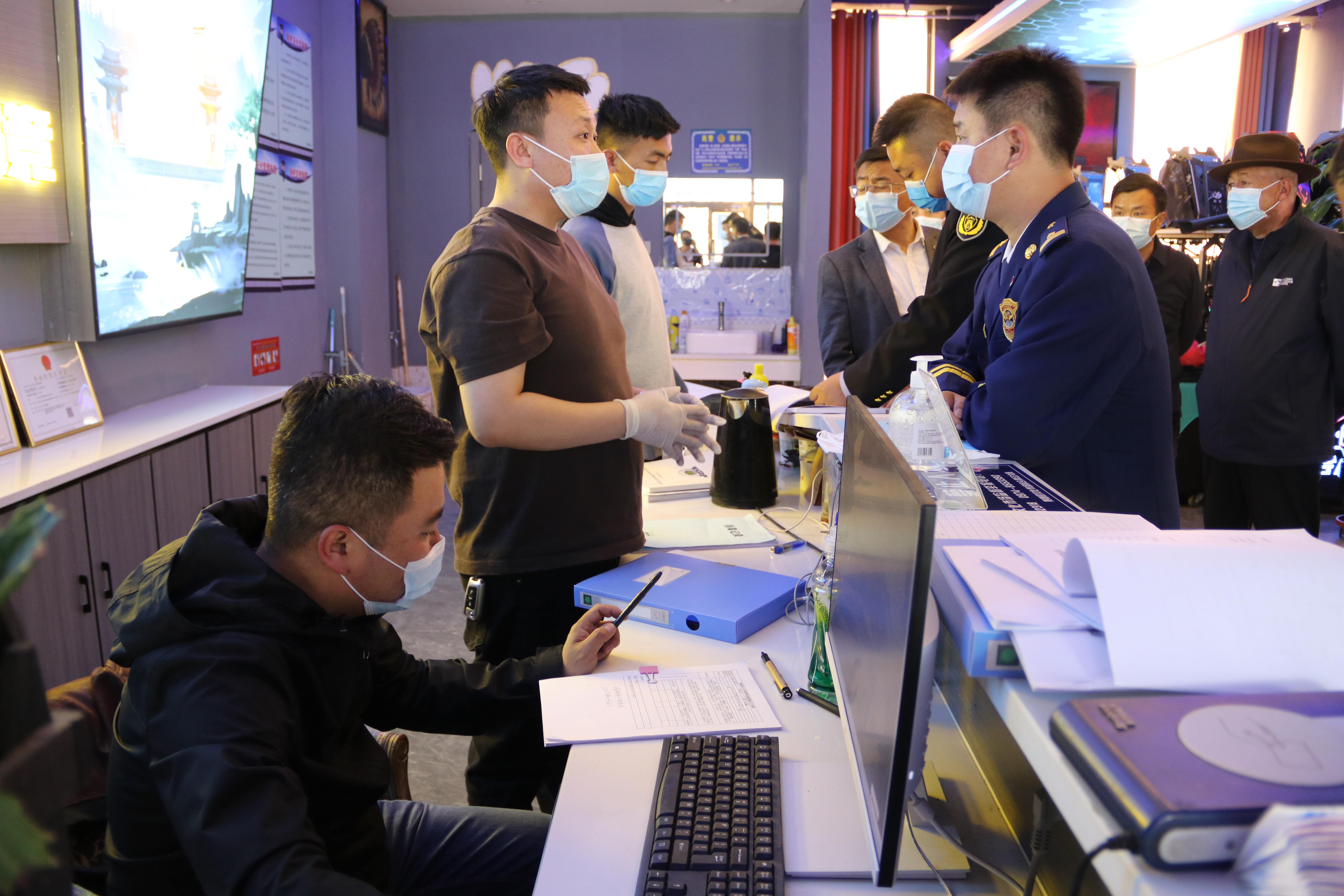 检查组先后来到竞宿网络会所、光粒电竞网吧、虫洞电竞网咖等互联网上网服务营业场所,采取现场察看、查阅资料、现场询问等形式,重点检查营业场所证照悬挂、核查实名登记记录台账、显著位置是否设有未成年人禁入警示牌、是否接纳未成年人上网等内容。同时,对场所内环境卫生、疫情防控、控烟、安全标识、应急通道畅通、消防安全设施建设是否完备、经营人员对消防器材的使用及维护等情况进行了详细检查及督导。